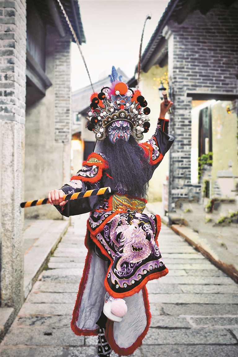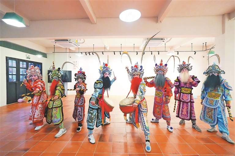 在观澜古墟,青年们换上精美服饰练习英歌舞。