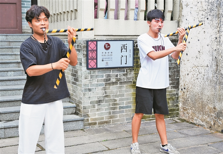 夜幕降临,灯光秀的绚丽背景下,急促锣鼓声一响,一群“梁山好汉”闪亮登场。此时此刻,他们不再只是城市里的“打工人”,也不是一味沉迷于手机的游戏青年,而是成为传统文化的追光者,用青春筑起古今对话的桥梁,在新生的百年墟市久久传唱。