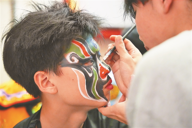 颜色艳丽的油彩盛在硬纸皮上,没有专属化妆师,也没有化妆桌椅,一群顶着锡纸烫发型的“小孩哥”席地而坐,边看手机里的上妆教程,边给同伴画脸谱。他们中,大部分才十六七岁,年长一些的也才20出头,但聊起英歌,他们的眼睛闪闪发亮,言语中透着喜悦。