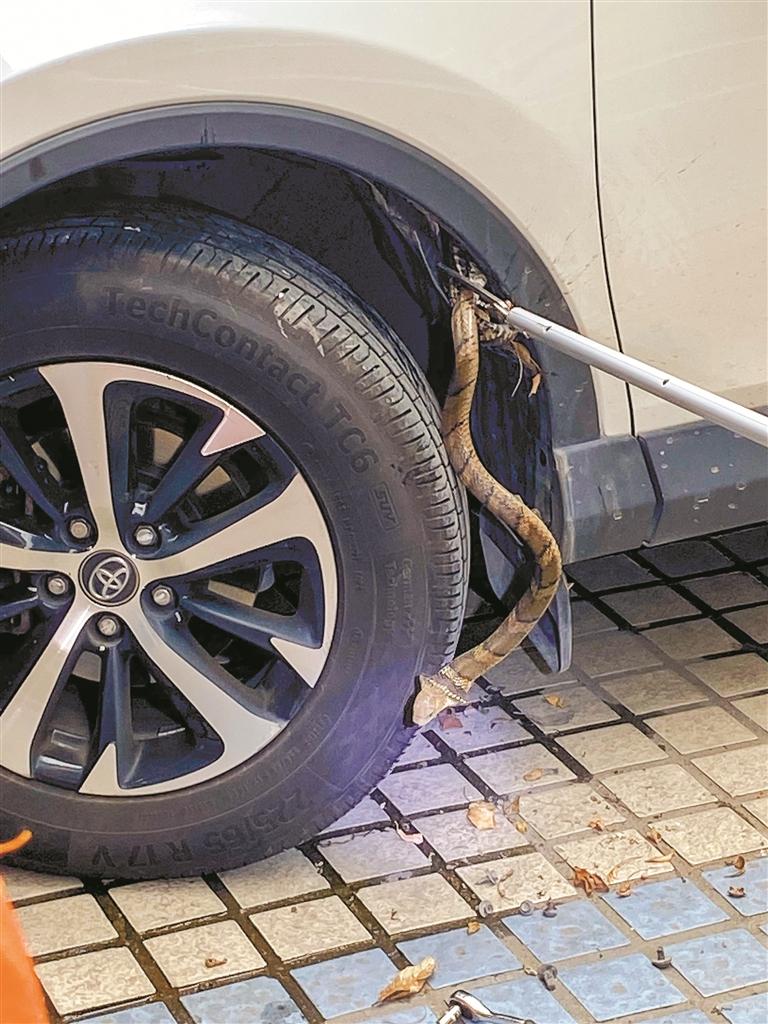 5月11日下午,深圳消防119指挥中心接报称,龙华区大浪街道一小区停车场内有蛇钻进车内。接警后龙华区大浪消防救援站立即出动1辆消防车、6名消防员到场处置。