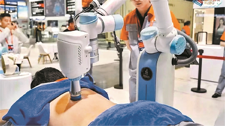 AI面诊已经很新奇了?在山东展区,你还能看到机器人按摩师现场理疗。遨博超V热疗机器人以柔性化协作机械臂为核心,配备加热理疗末端工具,通过3D结构光扫描人体轮廓,结合力控和三维感知技术,在人体经络上“走出”最佳路径。从内置健康数据,到数字化信息跟踪记录,遨博超V热疗机器人还能搭建“千人千面”数据库,无论“防久坐僵硬”还是“助寒湿疏通”,都能定制出个性化理疗方案。