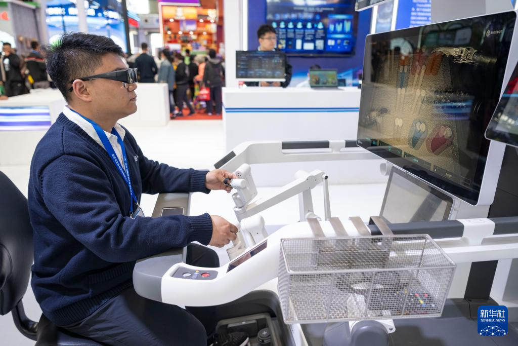 5月19日,在哈洽会主会场,与会者操控医疗机器人进行模拟手术。 新华社记者 谢剑飞 摄