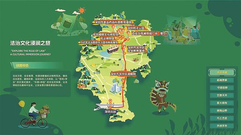 活动中,龙华区首条“法治漫游——法治文化浸润之旅”精品旅游线路发布。该线路以深圳民法公园、习近平法治思想学习宣传阵地展馆、民法博物馆、龙华婚姻文化体验馆、深圳市食品药品科普教育基地、龙华区安全教育基地等为核心打卡点,通过场景再造、互动体验、情感联结等方式,将法律知识融入旅游动线,将调解文化内涵、民法演进、婚姻家庭文化、食药安全等主题转化为可触可感的探索旅程,构建出“观-学-用”立体化法治教育场景,参观者可在普法解说中追溯法治脉络、体悟法律温度。