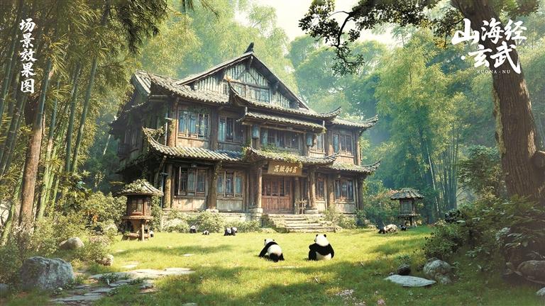 在已成型的作品中,处处可见现实元素,如川派建筑、熊猫竹林,以及依照神农架、昆仑山为原型设计的村庄、冰山等,故事内核叠加文化元素,再佐以AI“加速引擎”的催化作用,让畅想中的《山海经》诡谲想象以“可控美学”的形式真正落地。