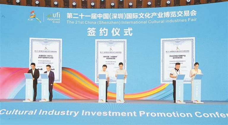 昨日上午,在第二十一届文博会文化产业招商会重大项目签约仪式现场,来自国内外各地的政府组团及部分头部企业亮出好项目,签下大订单。