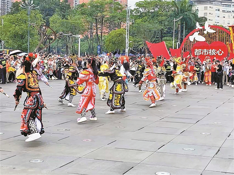 潮阳英歌舞为观澜河龙舟赛观众带来精彩表演。