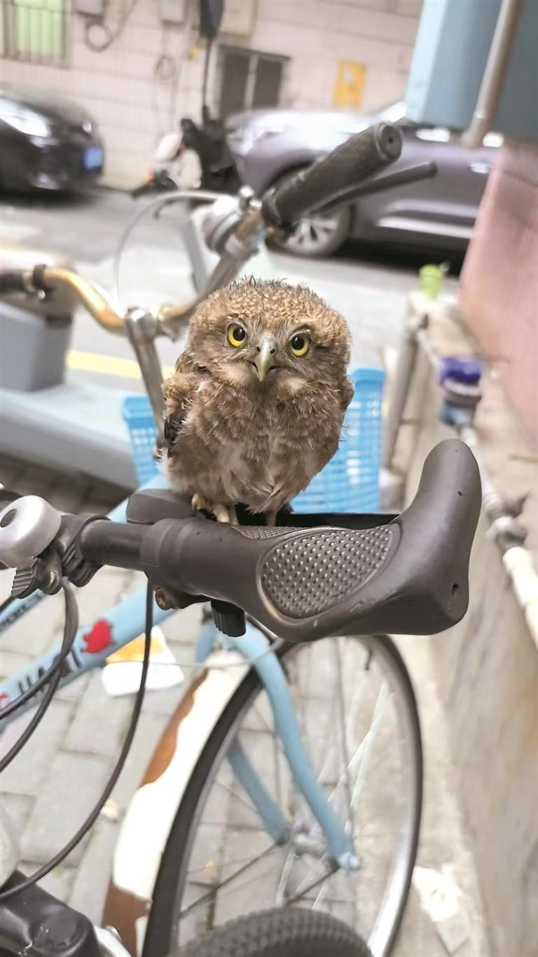 当天下午,居民何女士带着女儿在巷道里的自行车上发现站着一只猫头鹰幼鸟,看样子是刚学飞,飞累了落下来休息。她意识到这可能是保护动物,立即拍照发到了上围艺术村党群服务中心活动微信群,社区党员先锋志愿者和社区民警第一时间赶到现场。经现场查找线上资料比照辨认,确认这是一只领角鸮幼鸟,属于国家二级保护动物。经检查后发现,这只小猫头鹰无明显外伤,但因年幼尚不具备完全自主生存能力。