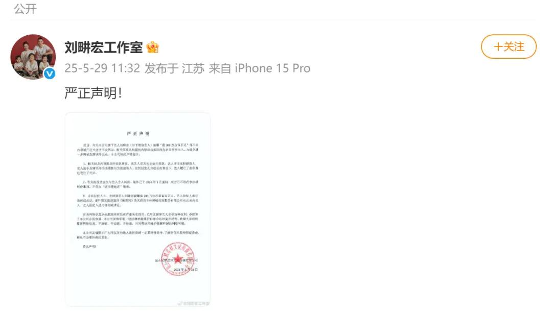 5月29日,@刘畊宏工作室 发布声明:近日,有关本公司旗下艺人刘畊宏(以下简称艺人)被曝“借700万台币不还”等不实内容被广泛关注并引发热议,相关信息从标题到内容均与实际情况存在事实出入。为避免进一步舆论发酵误导公众,本公司特此声明如下: