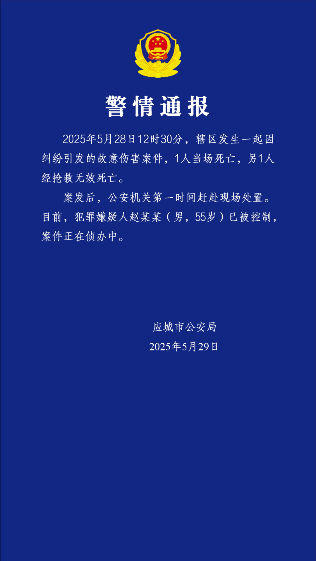 据应城公安微信公众号消息,5月29日,湖北应城市公安局发布警情通报:2025年5月28日12时30分,辖区发生一起因纠纷引发的故意伤害案件,1人当场死亡,另1人经抢救无效死亡。