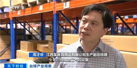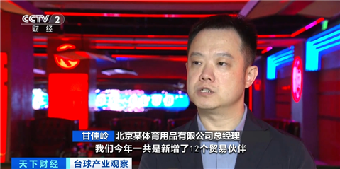北京某体育用品有限公司总经理 甘佳岭:我们今年一共新增了12个贸易伙伴。今年1-5月份海外市场的销售额增长达到40%,预计全年整体产销量有望继续突破历史峰值。