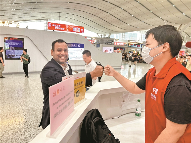 5月30日,在北站候车大厅服务台前,一位孟加拉国客商面露焦急,请求志愿者帮忙。原来,该客商因手机无网络,导致无法与客户取得联系。志愿者获悉情况后,立即打开个人手机热点功能,指导客商完成网络连接操作,顺利联网后该客商成功联系上客户。处理完事情后,该乘客表达了真挚的感谢,热情分享孟加拉国风景图片并诚挚邀请志愿者赴孟游玩。志愿者微笑回应:“很高兴能帮到您,欢迎您常来深圳。”