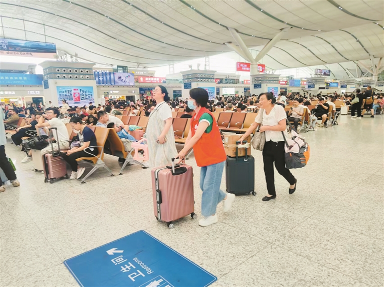 北站先锋服务队队员为旅客提供咨询指引服务。