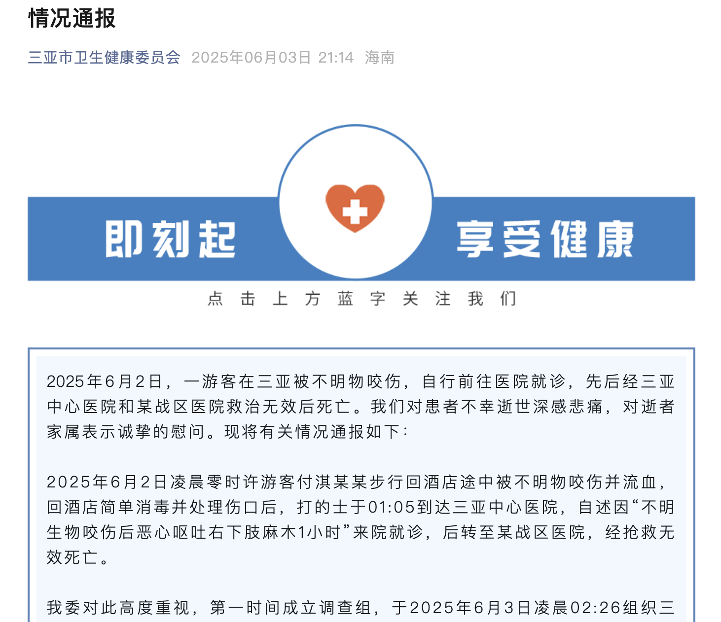 2025年6月2日,一游客在三亚被不明物咬伤,自行前往医院就诊,先后经三亚中心医院和某战区医院救治无效后死亡。我们对患者不幸逝世深感悲痛,对逝者家属表示诚挚的慰问。现将有关情况通报如下: