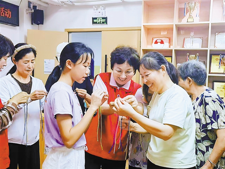 活动现场,社区手工达人高阿姨手持五彩线耐心讲解,大家神情专注仔细观摩,“先绕线,再打结,像这样交叉……”李奶奶手把手教孙女缠绕绳结,祖孙俩额头几乎碰到一起,专注的神情让空气中都漾着暖意。祖辈将生活经验化作编织技巧,孙辈则用好奇心点亮传统技艺的传承之光。孩子们举着作品蹦跳着展示,长辈们的笑颜里盛满骄傲,现场响起此起彼伏的赞叹声与欢笑声。