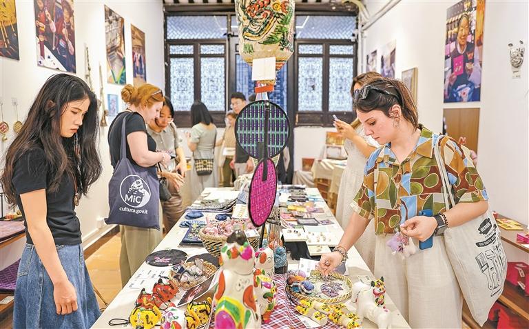 南头古城文创市集上的手工艺品吸引意大利客人驻足。