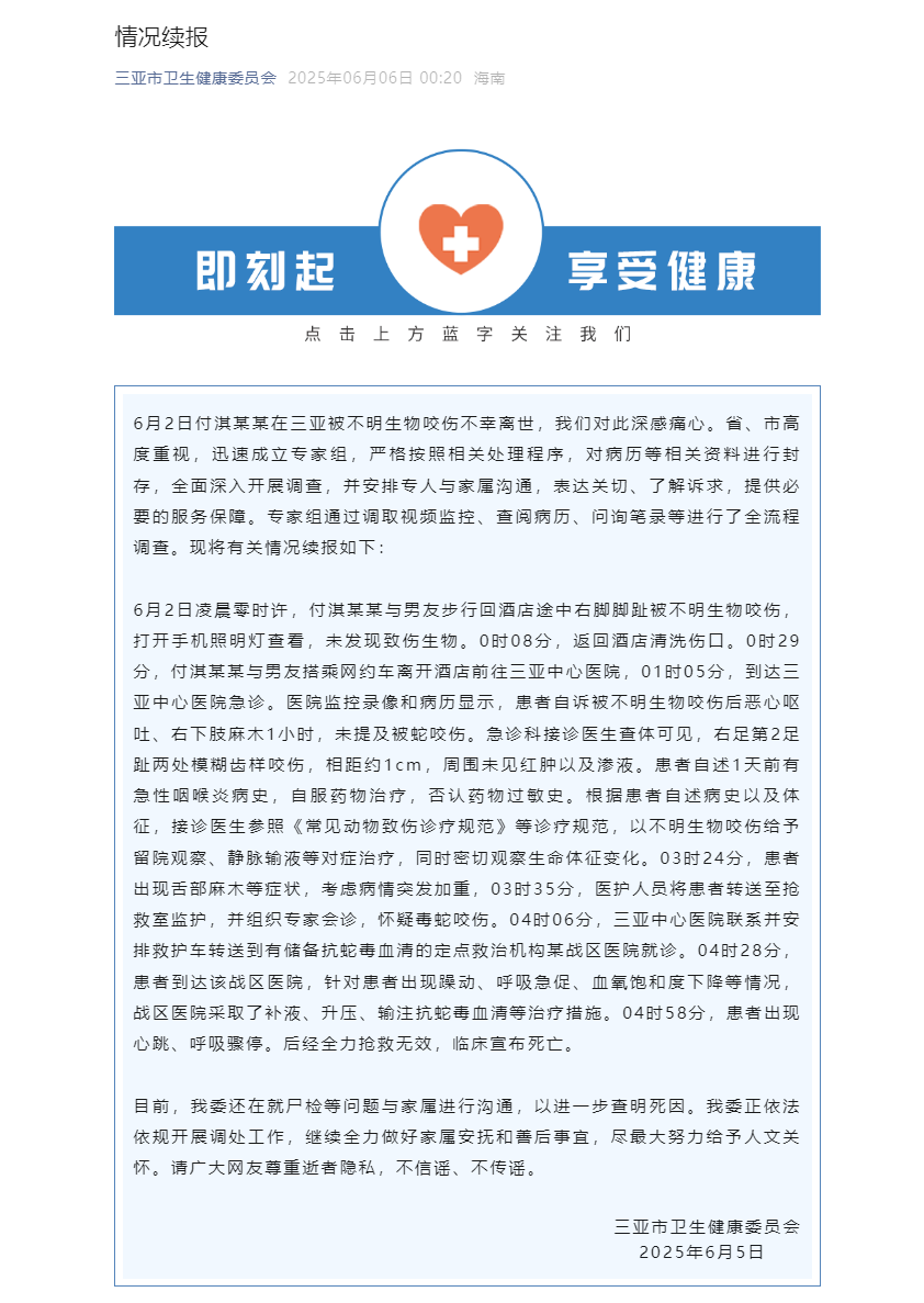 6月2日付淇某某在三亚被不明生物咬伤不幸离世,我们对此深感痛心。省、市高度重视,迅速成立专家组,严格按照相关处理程序,对病历等相关资料进行封存,全面深入开展调查,并安排专人与家属沟通,表达关切、了解诉求,提供必要的服务保障。专家组通过调取视频监控、查阅病历、问询笔录等进行了全流程调查。现将有关情况续报如下:
