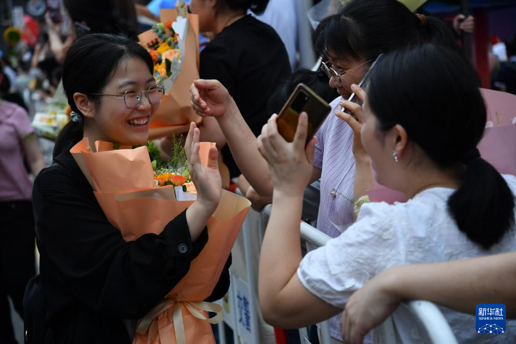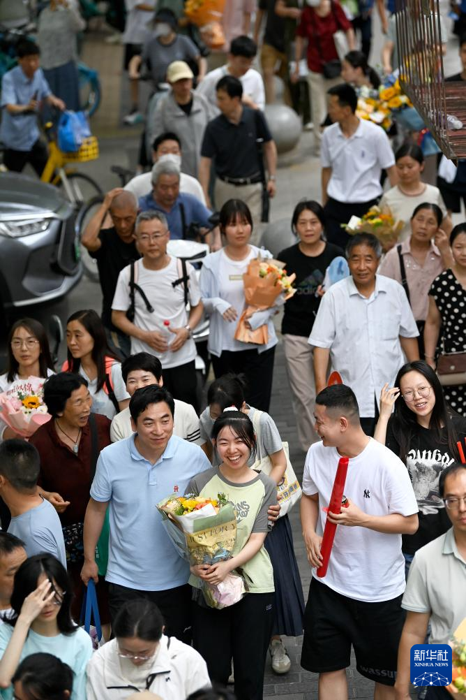 6月9日,在长沙市第一中学考点,一名家长(右一)迎接考生走出考场。新华社记者 陈思汗 摄