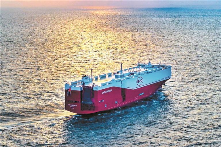 2024年,深圳新能源汽车产业产量增长69.2%,带动深圳汽车产量跃居全国城市首位,产业产值加速迈向万亿级。图为今年4月22日,全球最大汽车运输船比亚迪“深圳号”(BYD SHENZHEN)正式启航。(比亚迪供图)