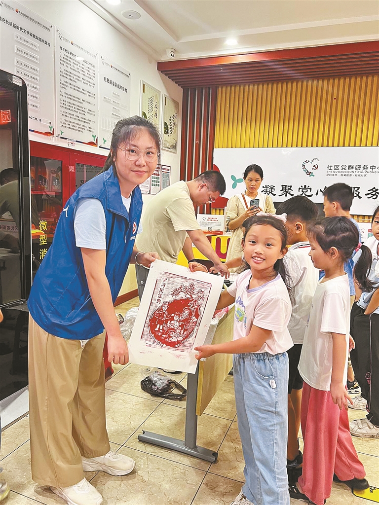 观澜街道“法律明白人”带领青少年完成法治版画。