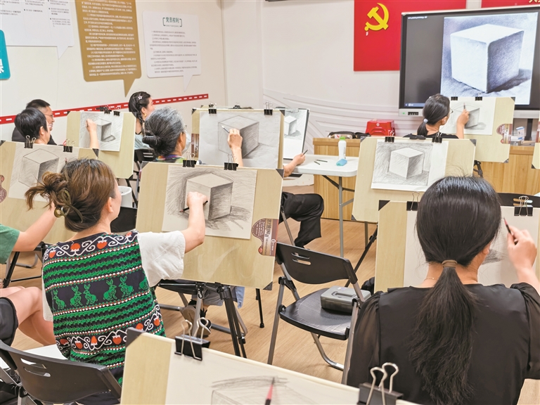 “素描是用线条对话的艺术。”课堂上,专业美术老师先向学员们介绍画架如何根据个人的身高摆放,如何调节高度、角度,并介绍了不同型号画笔的笔触特点。随后,老师带领学员练习基础线条,竖线的挺拔、横线的平直、斜线的角度把控,以及铅笔轻重交替呈现的颜色渐变……随着学员们的努力练习,纸张上渐渐布满深浅不一的笔触。“握笔要放松,线条才有呼吸感。”老师穿梭于学员间,手把手纠正他们的握笔姿势,指导排线技巧。