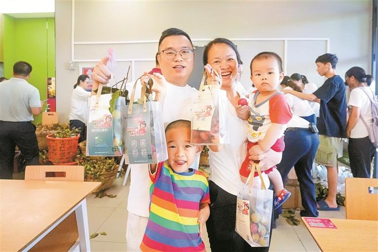 朱伟海一家领到荔枝后开心留影。深圳晚报记者 严文婷 摄