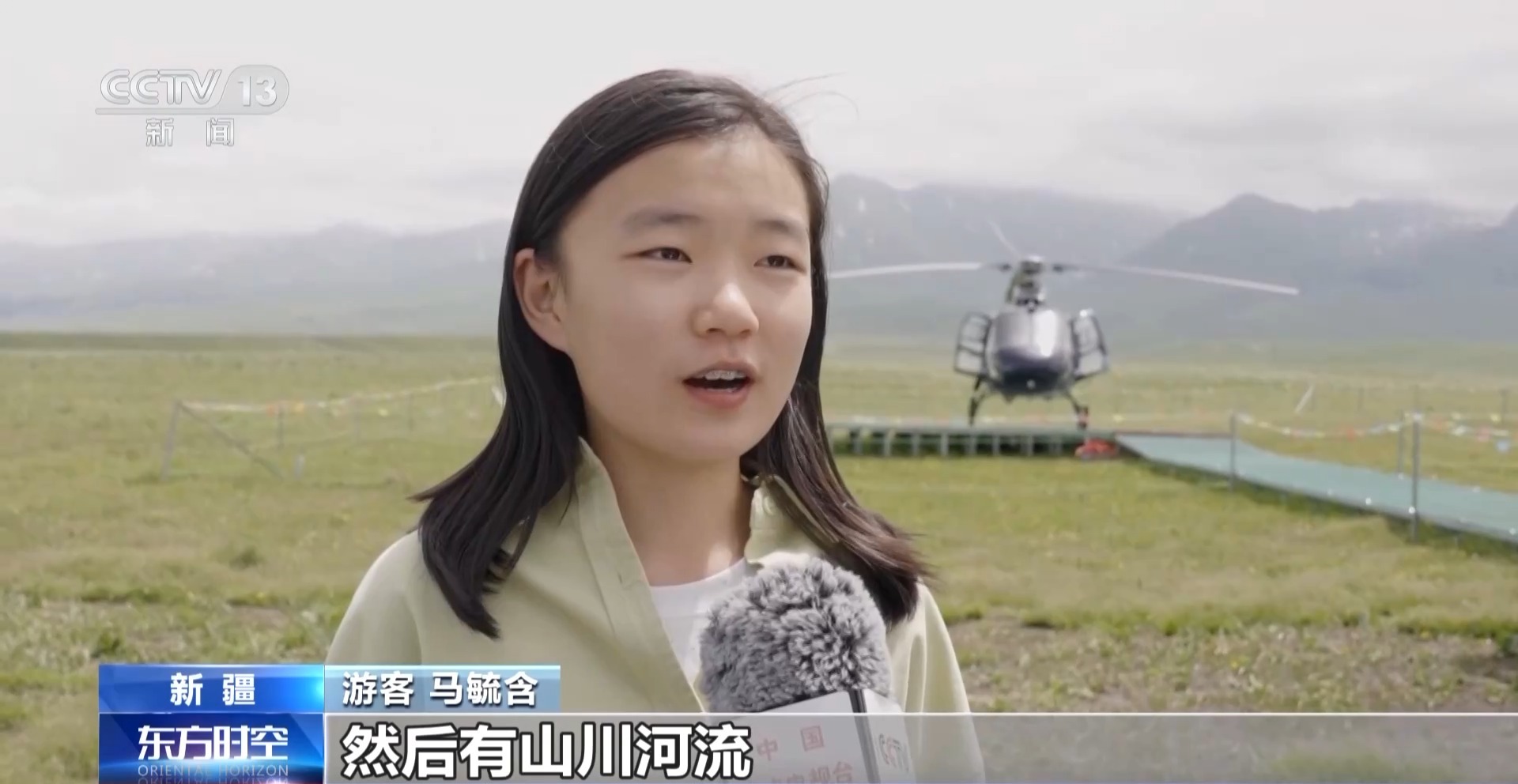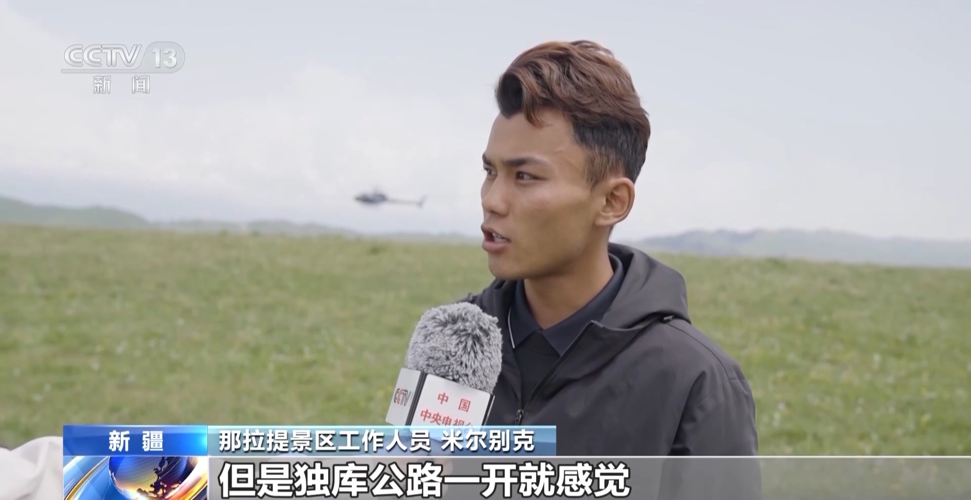 那拉提景区工作人员 米尔别克:开之前,我们一架飞机一天可能飞个9趟、10趟这样,很少。但是独库公路一开,就感觉旅游旺季马上就来了,我们现在两架飞机一天可能飞个90趟左右,频率明显变高了。