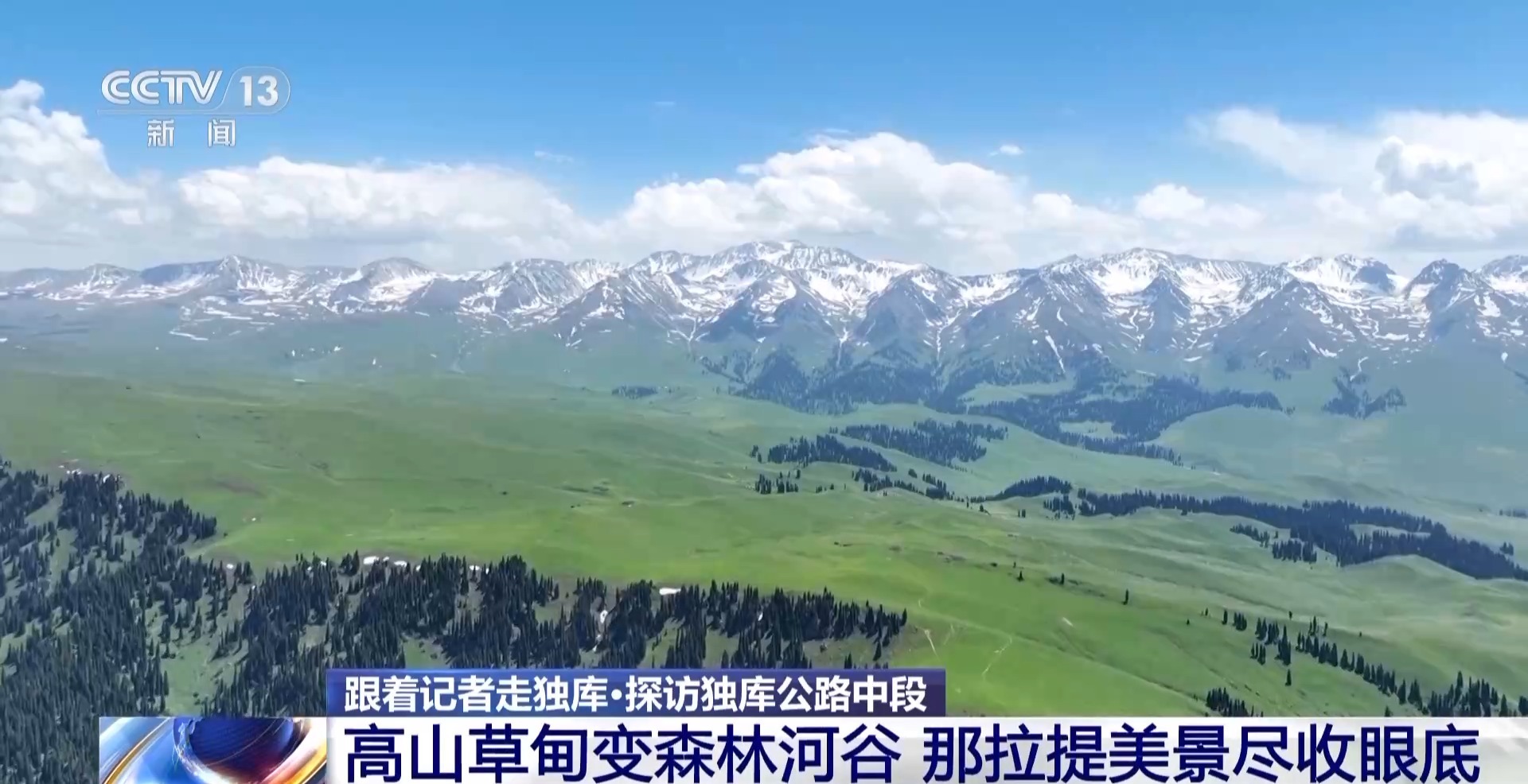 沿着独库公路抵达那拉提镇,公路两侧连片的青翠草甸如绿毯铺展,三十余米高的云杉直指苍穹,远处雪山巍峨壮丽,共同勾勒出层次分明的立体画卷。