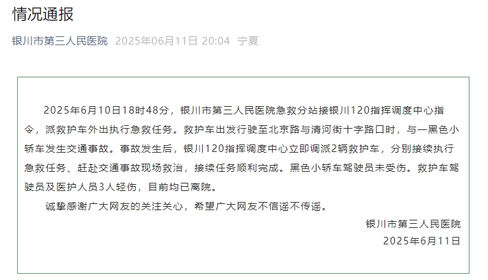 央视网消息:银川市第三人民医院6月11日通报,6月10日18时48分,银川市第三人民医院急救分站接银川120指挥调度中心指令,派救护车外出执行急救任务。救护车出发行驶至北京路与清河街十字路口时,与一黑色小轿车发生交通事故。事故发生后,银川120指挥调度中心立即调派2辆救护车,分别接续执行急救任务、赶赴交通事故现场救治,接续任务顺利完成。黑色小轿车驾驶员未受伤。救护车驾驶员及医护人员3人轻伤,目前均已离院。