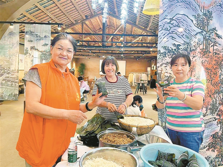 端午节期间,辖区居民在茜坑老村包粽子。