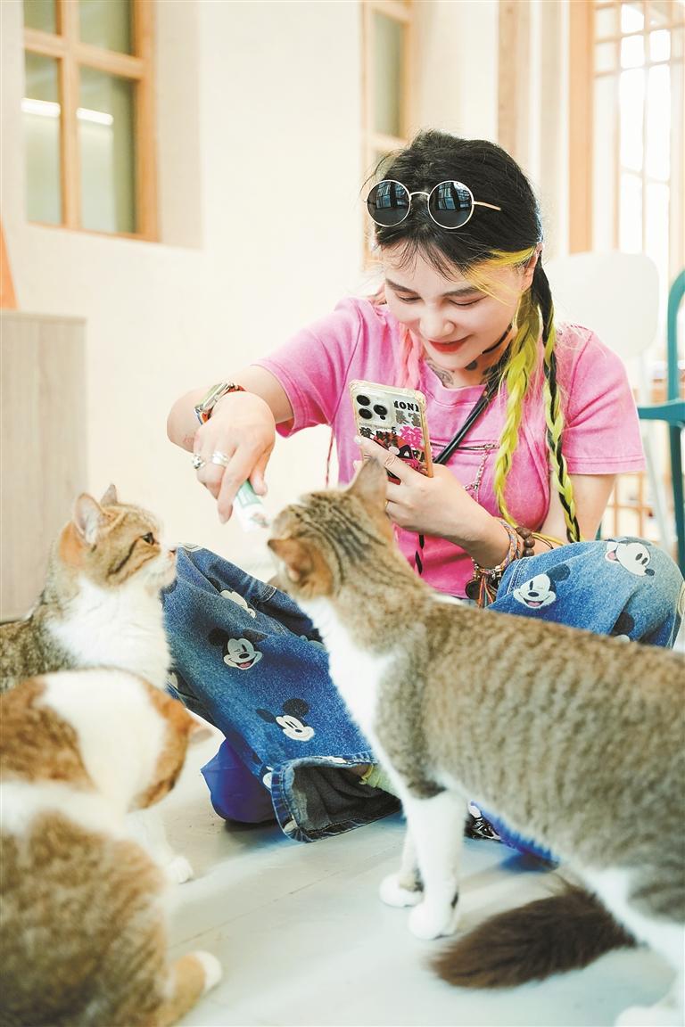 侘极居猫咖馆,市民跟猫互动玩耍,享受美好的时光。