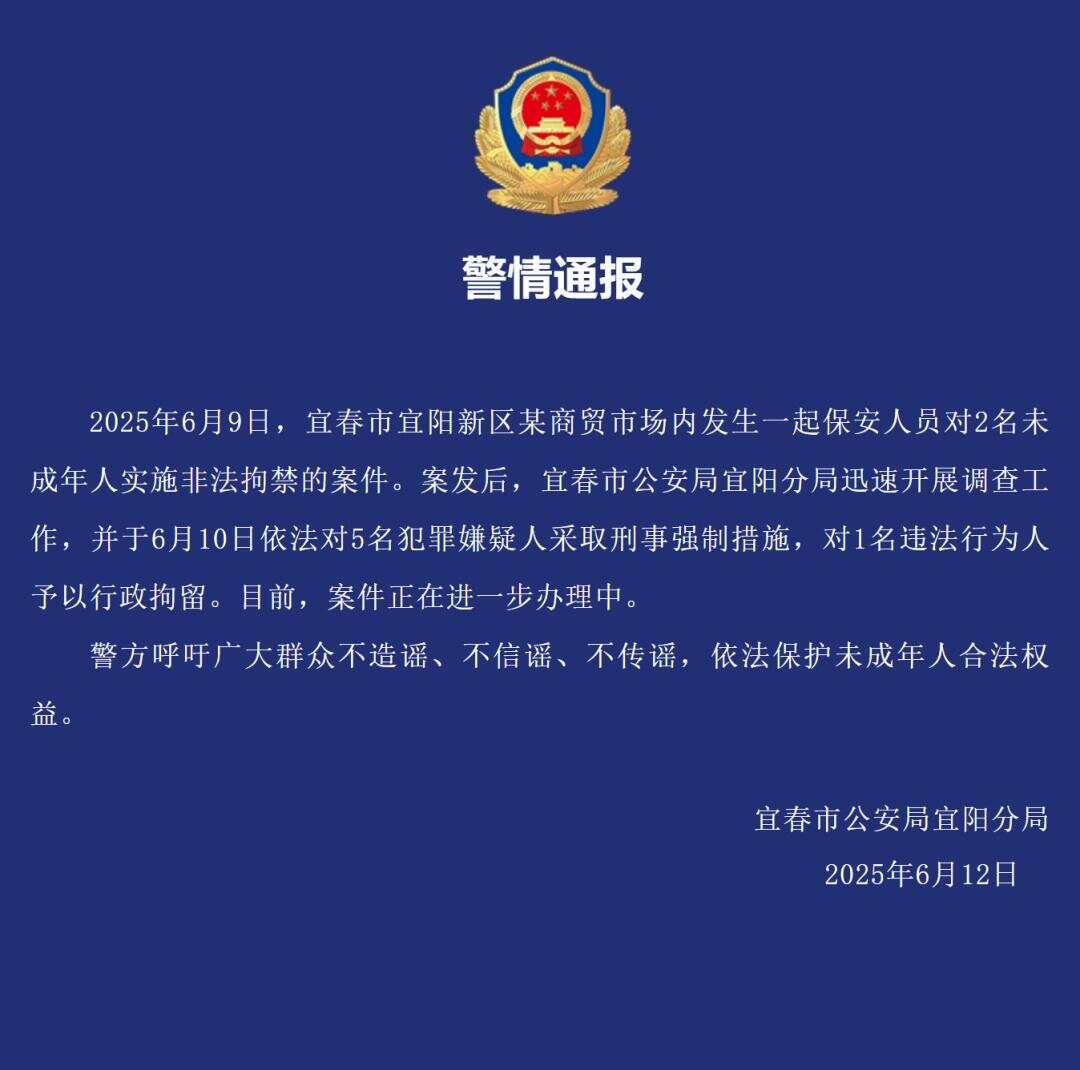 6月12日,江西省宜春市公安局宜阳分局发布警情通报:2025年6月9日,宜春市宜阳新区某商贸市场内发生一起保安人员对2名未成年人实施非法拘禁的案件。案发后,宜春市公安局宜阳分局迅速开展调查工作,并于6月10日依法对5名犯罪嫌疑人采取刑事强制措施,对1名违法行为人予以行政拘留。目前,案件正在进一步办理中。