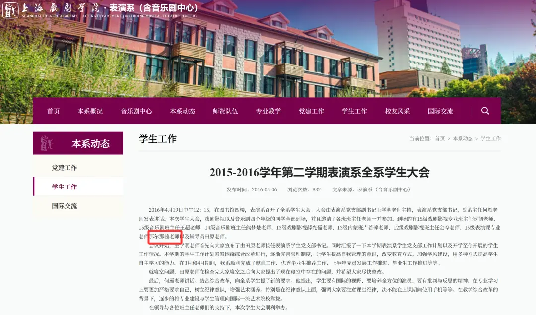6月13日,现代快报记者检索发现,在上海戏剧学院表演系网站上,有一篇标题为《2015-2016学年第二学期表演系全系学生大会》的文章,其中提到那尔那茜曾以15级表演课专业老师的身份参与全系学生大会。