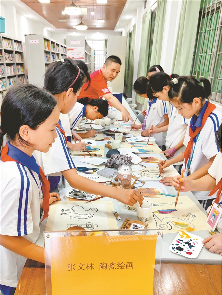 活动现场,麦金画、染色剪纸、微刻画、客家糯米酒、嵌瓷、书法、古筝、皮影雕刻、绳结艺术、陶瓷绘画共十个非遗项目齐聚一堂。民间文艺志愿者们化身“文化使者”,将自己的“看家本领” 毫无保留地展示出来。他们用灵巧的双手、精湛的技艺,把传统文化的独特魅力展现得淋漓尽致,引得师生们驻足围观,赞叹连连。
