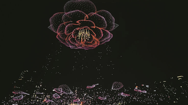 11787架无人机在夜空中绽放巨型“山茶花”。