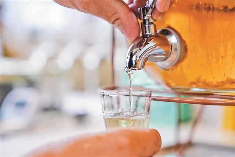 新鲜的树莓,压碎后注入发酵的康普茶内,冲撞融合之下形成混合水果的茶饮,酸甜可口;原味茶液则酸度更高,茶味更浓,在口感上却有啤酒风味。春哥认为:“它完全可以作为啤酒的替代饮品。”