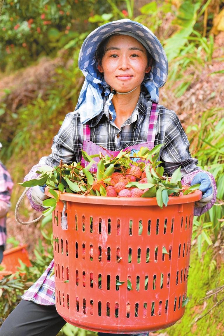 暮色中的果园,阿芬和姐妹们还在挑拣当天采摘的荔枝,帮助果场打包发货。汗水滴落在翠绿的叶子上,也滴落在颗颗饱满的荔枝上。