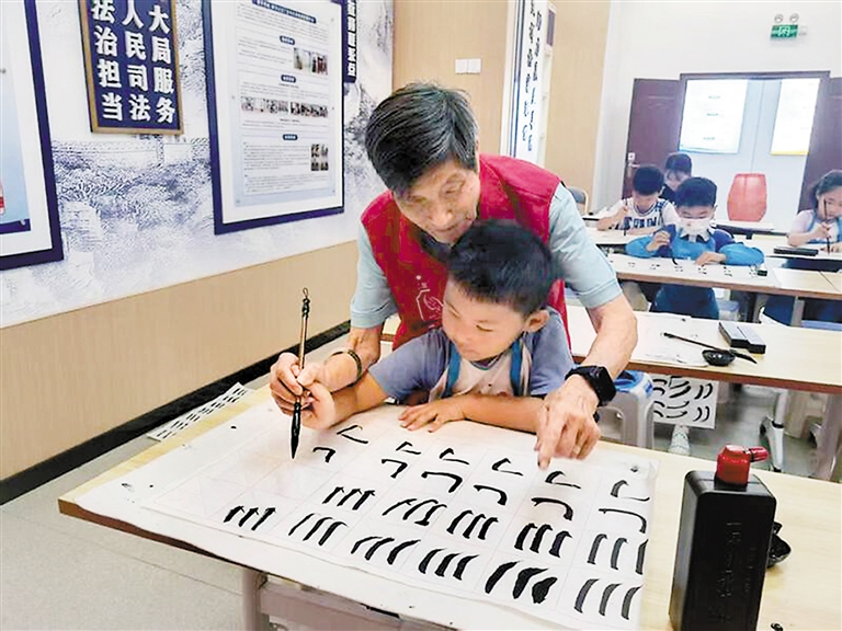 ▲廖学勤正在社区少儿书法班教青少年写书法。受访者供图
