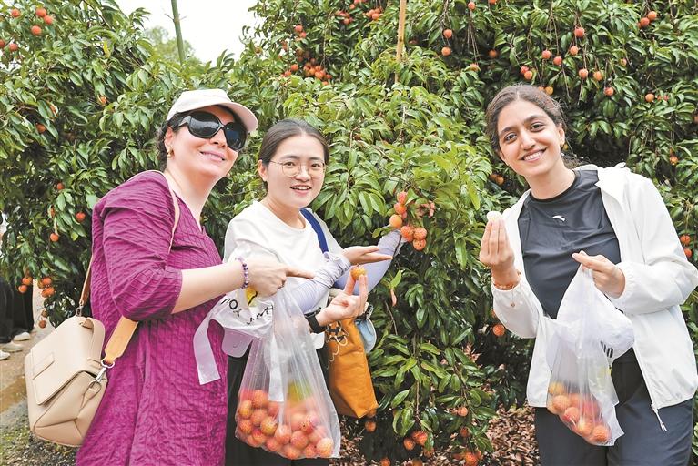清晨的果场弥漫着清甜气息,外宾们一边跟随果农穿梭于荔园,并在果场负责人的介绍下,学习辨别妃子笑与糯米糍。一边拿着手机纷纷拍照,与这当红的“荔枝”同框出镜,竖指点赞。