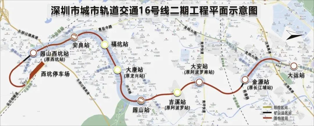 地铁16号线二期线路由16号线一期工程起点大运站引出,沿龙岗大道、长江埔路、万福路、公园路、沙荷路、惠盐中路敷设,终至园山西坑站。