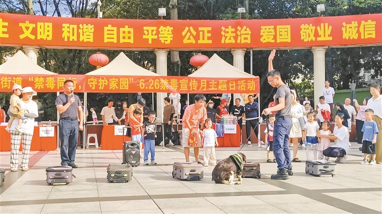 活动创新采用了“专业展示+互动体验”相结合的模式,将禁毒知识融入群众喜闻乐见的“沉浸式课堂”。深圳市公安局警犬基地带来的缉毒犬查毒实战演练成为现场焦点,缉毒犬们精准展示了服从指令、箱包看守、弹射盒搜毒和箱包搜毒等专业技能,其敏锐的嗅觉和高效的执行力赢得了现场居民的阵阵掌声,让大家近距离感受到禁毒工作的专业与不易。
