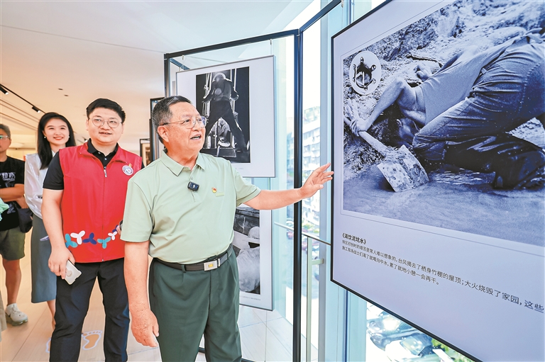 许多极具历史意义的照片在活动现场展出。步入展厅,“拓荒印记”篇章瞬间将观众拉回上世纪80年代初的激情岁月。一幅幅由基建工程兵随军摄影师周顺斌拍摄的珍贵黑白照片,再现了那段波澜壮阔的拓荒史。“我们当时住的是简易工棚,台风一来屋顶都掀翻了,锅碗瓢盆全露在外面。”周顺斌现场向大家讲解这些照片背后的故事。正是这些头戴柳条帽、肩扛简易工具的战士们,在荒滩野岭中挥汗如雨,为这座新城夯下第一块基石。