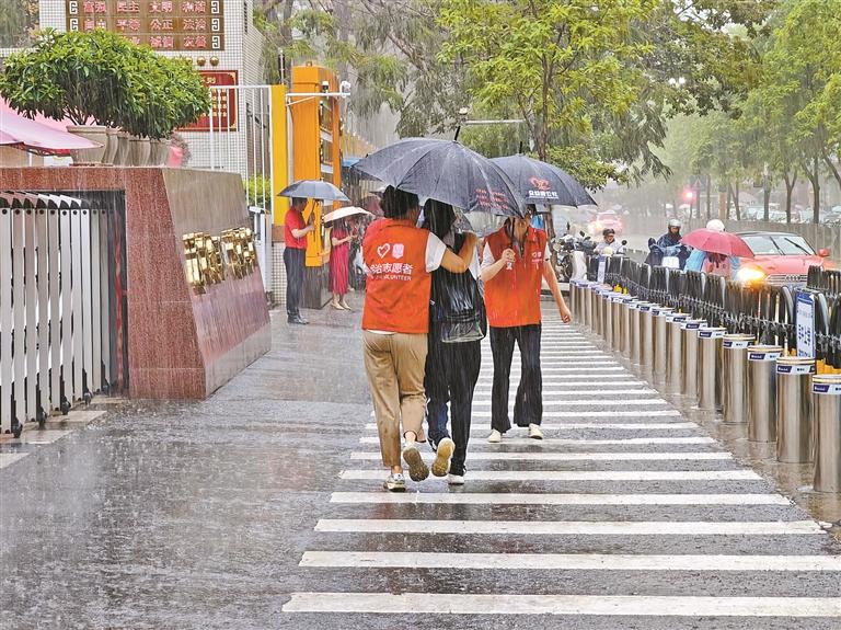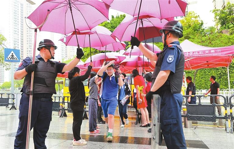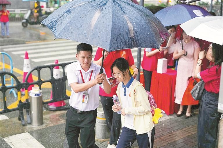 龙华区外国语学校贴心地为考生们撑伞,护送中考学子进入考场。
