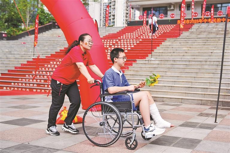 民治中学考点老师护送脚受伤的考生进入考场。