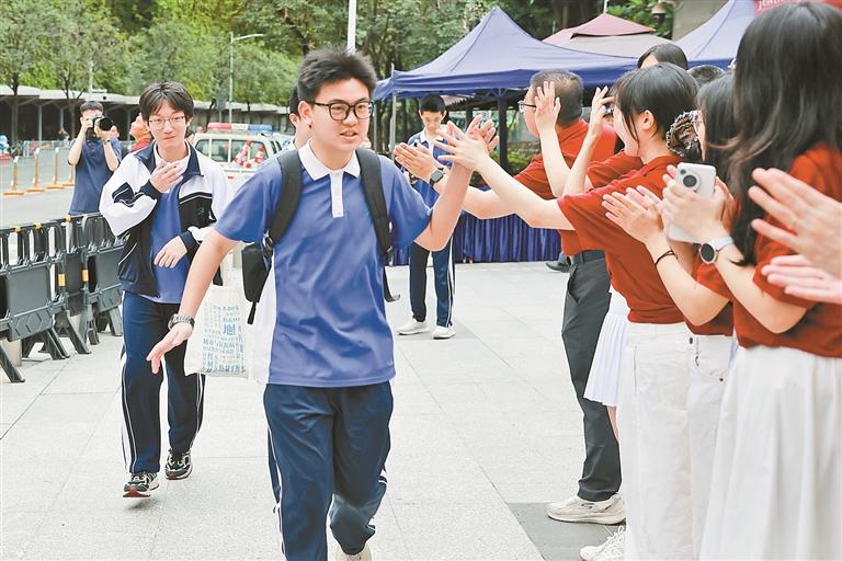 为助力考生从容应考,各学校纷纷开展暖心送考活动。昨日清晨,记者在深圳市龙华区外国语学校教育集团看到,校门两侧张贴着鲜红的送考对联,上联“龙跃云津,心驰星汉,长风破浪鹏举九万里”,下联“光射牛斗,笔落惊鸿,会挽雕弓直下看山河!”送考教师与学生们击掌、拥抱,现场“加油”声此起彼伏,场面热烈。考前一日,各学科教师深入班级,梳理考点、传授答题技巧,还贴心疏导学生情绪。班主任们为学生准备透明文具袋,帮忙收发身份证、准考证,关怀备至。