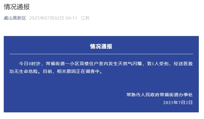 7月2日,虞山高新区发布通告,今日0时许,常福街道一小区顶楼住户室内发生天然气闪爆,致1人受伤,经送医救治无生命危险。目前,相关原因正在调查中。