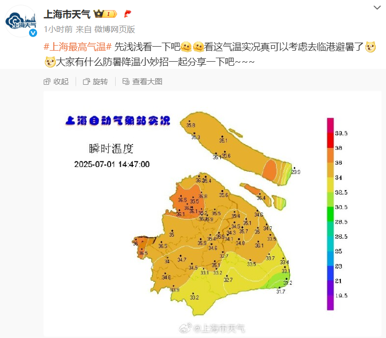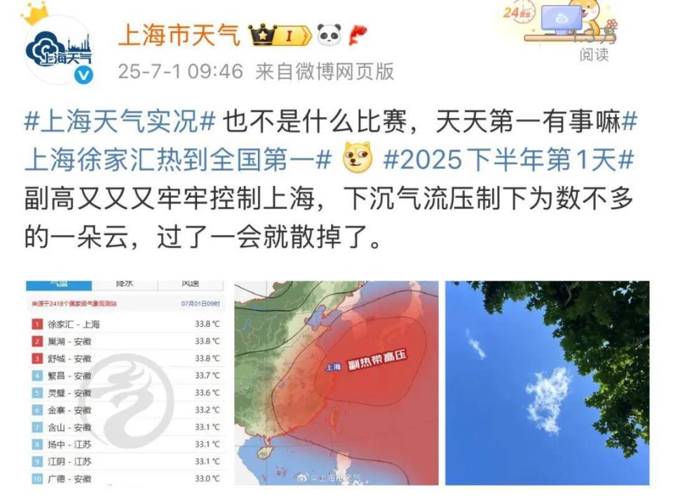 下半年已开启,副高又又又牢牢控制上海,据@上海市天气,昨天早上9时,上海徐家汇又热到了全国第一。