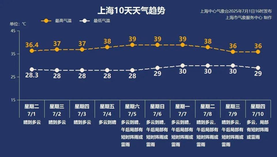 本周工作日副热带高压依旧强盛,上海处在高压中心,下沉气流控场,不见雨水踪影。最高气温在37℃、38℃附近。周六起副热带高压稍有减弱,午后局部对流降水重新返场。气温进一步升高,双休日和下周初最高气温或可接近40℃。高温天气连续出击,大家防暑降温措施一定不能松懈。