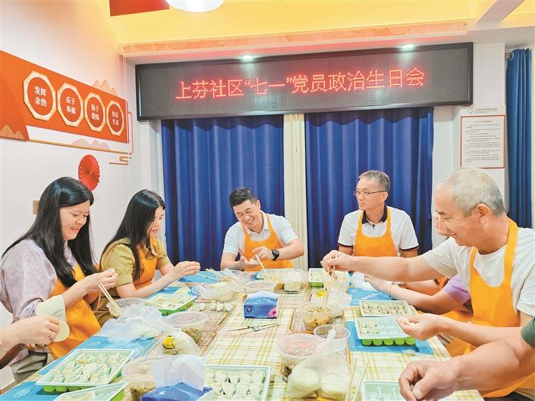 仪式环节之后,现场氛围转为温馨融洽。党员们围坐一桌,一边巧手包饺子,一边畅谈交流。热气升腾中,老党员们忆往昔峥嵘岁月,深情讲述扎根社区的奋斗故事;新党员们则真诚分享在组织培养下的成长感悟。