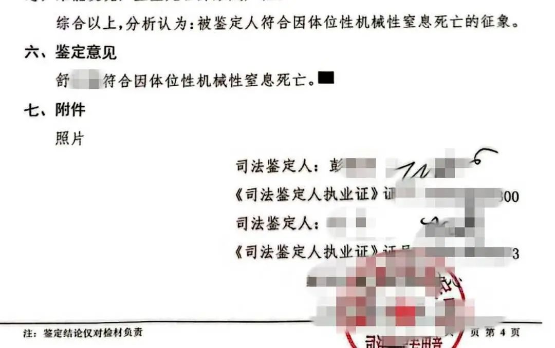 次日凌晨1时许,舒某起夜时发现舒某某还在趴着。身体还能动弹,便拍了拍其屁股后继续入睡了。早上6时许,舒某起床时,发现蓝色枕头搭在舒某某头上,舒某某面部朝下,面部挨着床单的部位发白,已无知觉。