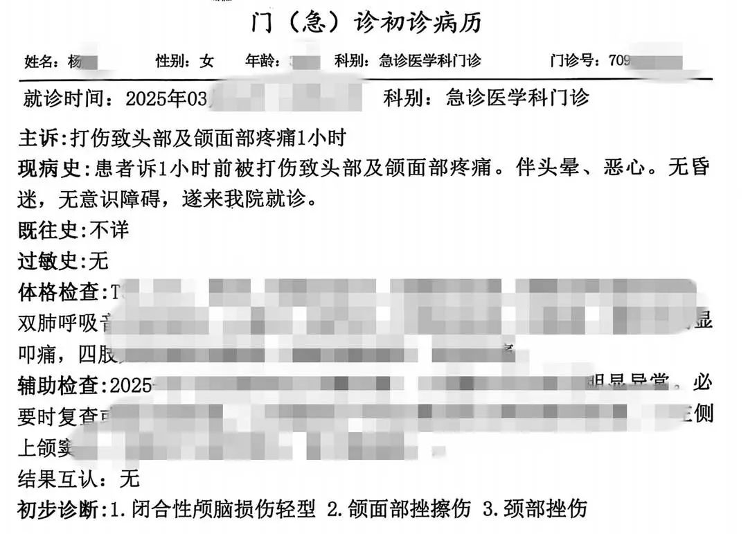 杨女士提供的2份病例显示,她和她母亲均被诊断为闭合性颅脑损伤轻型,分别有颈部挫伤和多处软组织损伤。一份襄阳市公安局东津新区分局的行政处罚决定书显示,舒某的行为已构成殴打他人,行政拘留10日并处罚款五百元。